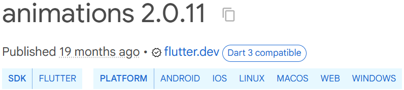 일단 사용하기 위해선 먼저 프로젝트의 pubspec.yaml 파일 안에 animations 패키지를 추가해야 할 것이다.