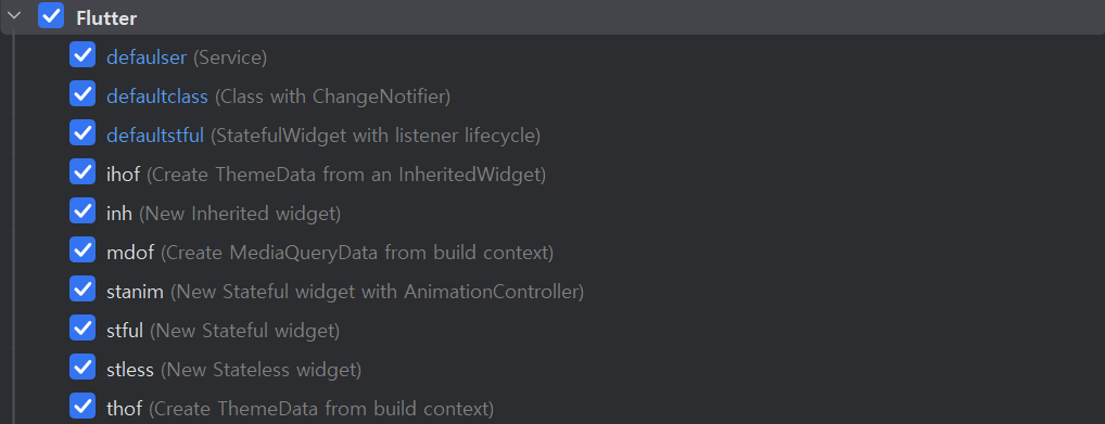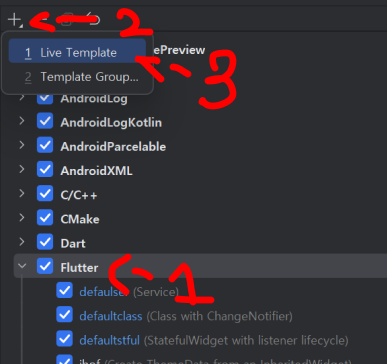 사진 속 순서대로 Flutter 를 선택한 후 위의 + 버튼을 누르고 Live Template 를 선택한다.