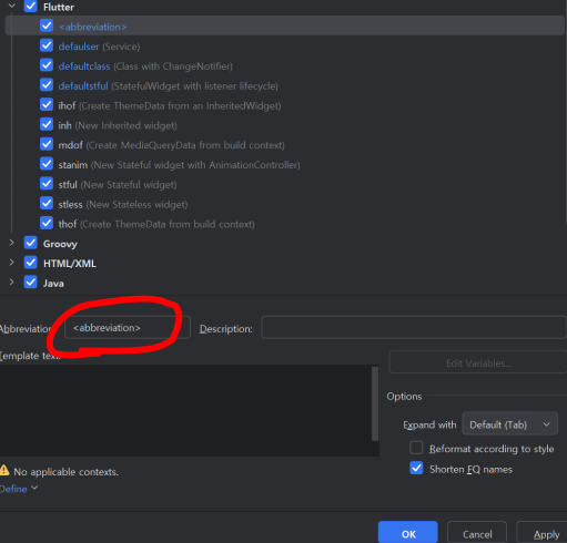 그럼 위와 같이 <abbreviation> 라고 하나 만들어졌을 것이다. 지금 저부분이 이제 우리가 코드에서 서제스쳔에 표시되는 이름이자 불러올 수 있는 key 같은 이름이다.