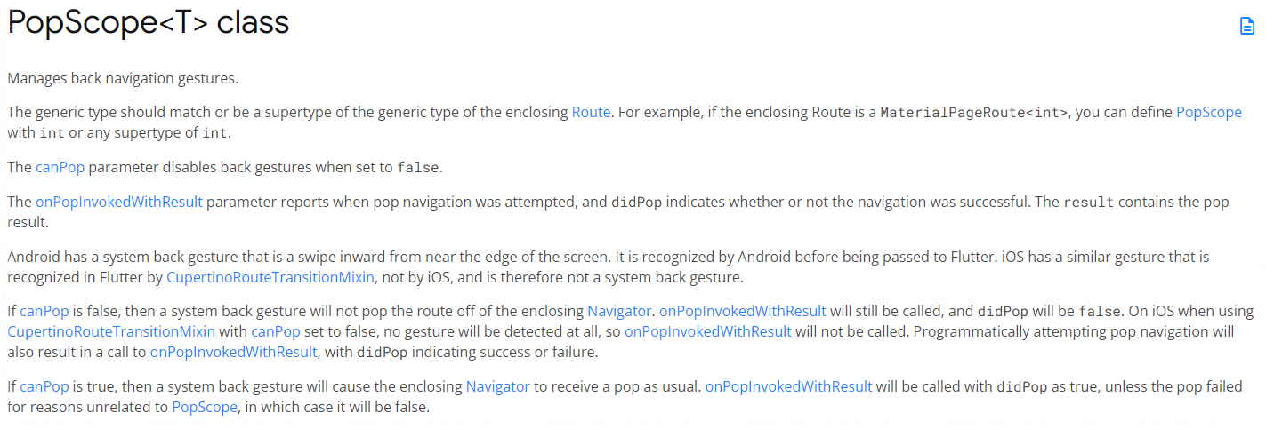 PopScope 위젯은 flutter 에서 뒤로 가기 기능을 구현할 때 사용하는 위젯으로 예전에는 WillPopScope를 사용했지만 이제는 공식문서에서도 PopScope를 사용하라고 권고하고 있다.ㅡ