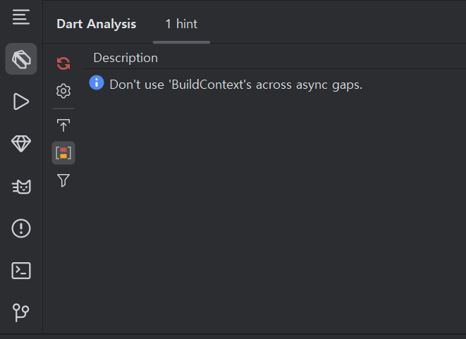 일단 이 기능은 Dart Analysis에 있다. 맞다. 벌레처럼 생긴, 코드 오류 뜨면 나오는 거 말이다.