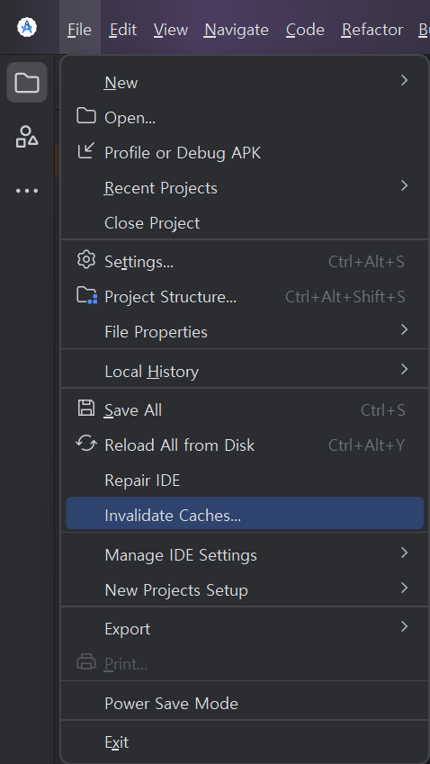 Dart Analysis는 코드 자동 완성, 오류 감지, 린트 검사, 중복 코드 경고등 우리가 코드를 작성할 때 필수불가결한 존재인데이런 오류가 떴을 때 대게 난 Main Menu → File에 있는 Invalidate Cashes를 이용하곤 했다.